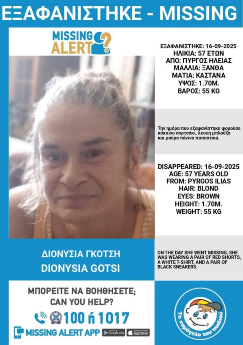 Συναγερμός έχει σημάνει στον Πύργο Ηλείας για την εξαφάνιση της 57χρονης Διονυσίας Γκότση, τα ίχνη της οποίας χάθηκαν στις 16 Σεπτεμβρίου 2025. Η Διονυσία έχει ύψος 1,70 μ., βάρος 55 κιλά, έχει ξανθά μαλλιά και καφέ μάτια. Την ημέρα που εξαφανίστηκε, φορούσε κόκκινο σορτσάκι, λευκή μπλούζα και μαύρα πάνινα παπούτσια.