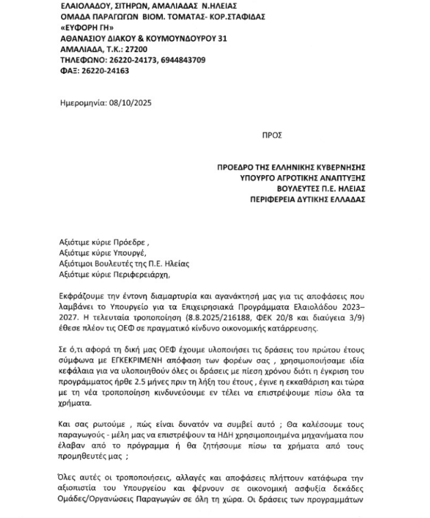 Τα αγροτικά ζητήματα επανέρχονται δυναμικά στο προσκήνιο, μετά τη νέα επιστολή του Προέδρου της Ομάδας Παραγωγών Αμαλιάδας, Χρήστου Βαλιανάτου, προς το Υπουργείο Αγροτικής Ανάπτυξης και Τροφίμων. Στην επιστολή του, ο κ. Βαλιανάτος εκφράζει έντονη αγανάκτηση για τις πρόσφατες αποφάσεις του υπουργείου που αφορούν τα επιχειρησιακά προγράμματα ελαιολάδου 2023-2027, τονίζοντας ότι οι ρυθμίσεις που υιοθετήθηκαν πλήττουν ευθέως τις οργανωμένες παραγωγικές δυνάμεις της περιοχής και δημιουργούν συνθήκες άνισης μεταχείρισης.