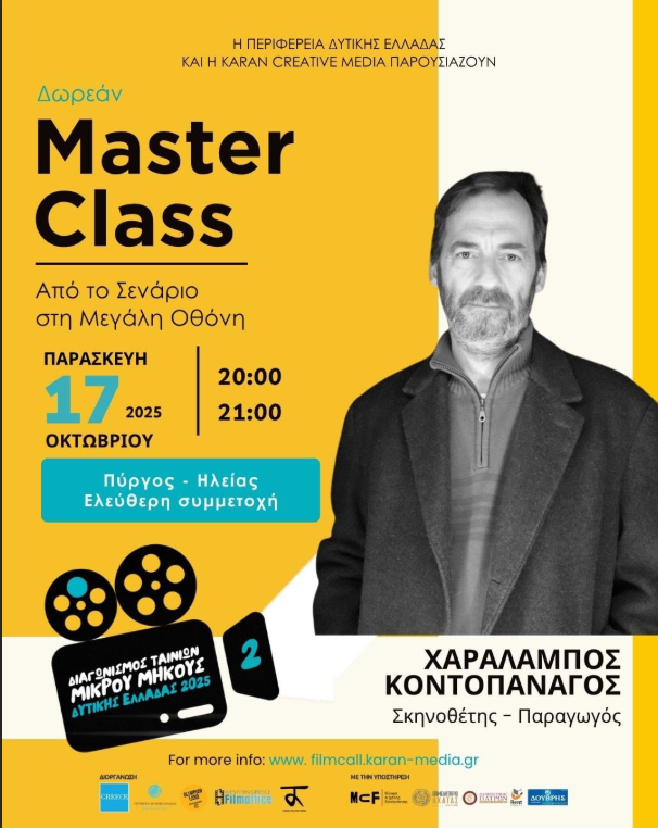 🕕 20:00 – 21:00 Χαράλαμπος Κοντοπάναγος «Από το σενάριο στη μεγάλη οθόνη» Μια πρακτική προσέγγιση στη μετατροπή της ιδέας σε ολοκληρωμένο σενάριο και στην προετοιμασία της κινηματογράφησης, με αναφορές σε πραγματικά παραδείγματα από τον χώρο του κινηματογράφου.