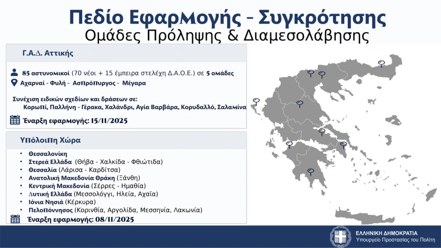 Σύμφωνα με τον κ. Χρυσοχοΐδη «οι ομάδες αυτές επιχειρησιακά υπάγονται στο ελληνικό FBI. Η Αττική υπάγεται απευθείας στην υπηρεσία αυτή, στην υπόλοιπη χώρα θα συνεργάζονται με τις τοπικές υπηρεσίες για την εμπέδωσε της τάξης Συνολικά οι περιοχές που θα αναπτυχθούν οι ομάδες της ΕΛΑΣ είναι 25 με 152 σημεία δράσης και 473 αστυνομικούς που ξεκινούν από το Σάββατο σε όλη την Ελλάδα ενώ ειδικά στην Αττική θα ξεκινήσουν την επόμενη εβδομάδα Διευκρίνισε, τέλος, ότι «οι 50 διαμεσολαβητές που θα προσλάβουμε θα αποτελέσουν τη γέφυρα διαλόγου με όλες τις ομάδες και τους οικισμούς ώστε η επιχείρηση να μην είναι μόνο αστυνομική αλλά να συμβάλει στην ασφάλεια και την κοινωνική ειρήνη».