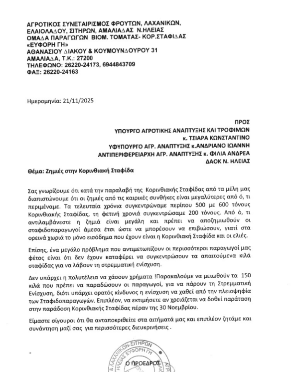 Η Ομάδα Παραγωγών υπογραμμίζει ότι η κορινθιακή σταφίδα αποτελεί “παραδοσιακό, εξαγώγιμο και ιστορικό προϊόν της Ηλείας”, προειδοποιώντας ότι χωρίς άμεση στήριξη «κινδυνεύει η βιωσιμότητα των εκμεταλλεύσεων και η συνέχεια του προϊόντος».