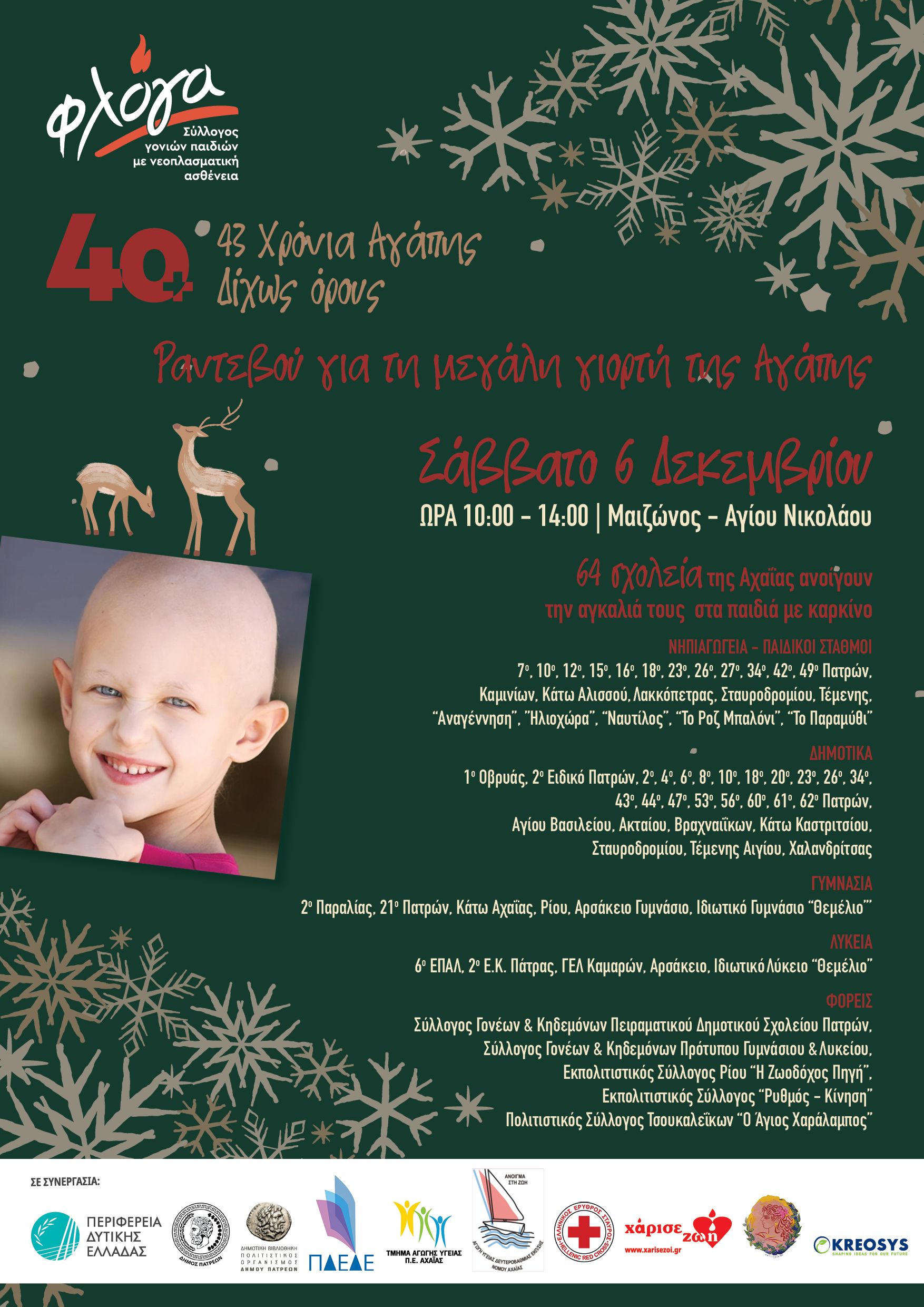 Οι μαθητές & οι μαθήτριες, οι εκπαιδευτικοί, οι Σύλλογοι Γονέων και Κηδεμόνων 64 σχολείων της Αχαΐας και το Παράρτημα Πάτρας του Συλλόγου Γονιών Παιδιών με Νεοπλασματική Ασθένεια «ΦΛΟΓΑ» σας προσκαλούν το Σάββατο 6 Δεκεμβρίου, ώρα:10.00, στην ξεχωριστή Χριστουγεννιάτικη γιορτή που αποτελεί πλέον θεσμό για την Πάτρα, στον πεζόδρομο Μαιζώνος και Αγίου Νικολάου. Όλοι μαζί θα στείλουμε μηνύματα Αγάπης και Ελπίδας στα παιδιά που πάσχουν από Καρκίνο.