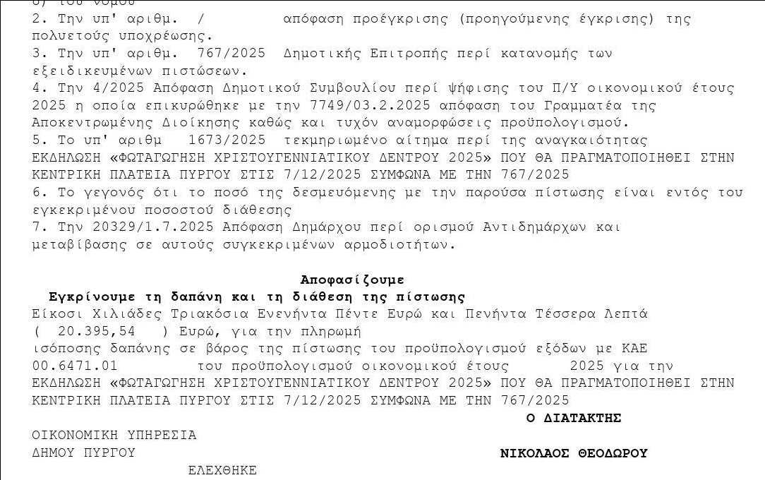 Την ώρα που ο πολίτης μετράει τα ρέστα στο σούπερ μάρκετ, ο Δήμος Πύργου δαπανά — με απίστευτη άνεση — χιλιάδες ευρώ για «γιορτινές εκδηλώσεις». Λες και το πρόβλημα της πόλης είναι η έλλειψη στολισμού. Λες και οι καταρρέουσες υποδομές, η ανεργία, η εγκατάλειψη και η μιζέρια θα λυθούν με μια μπουρμπουλήθρα φωτός.