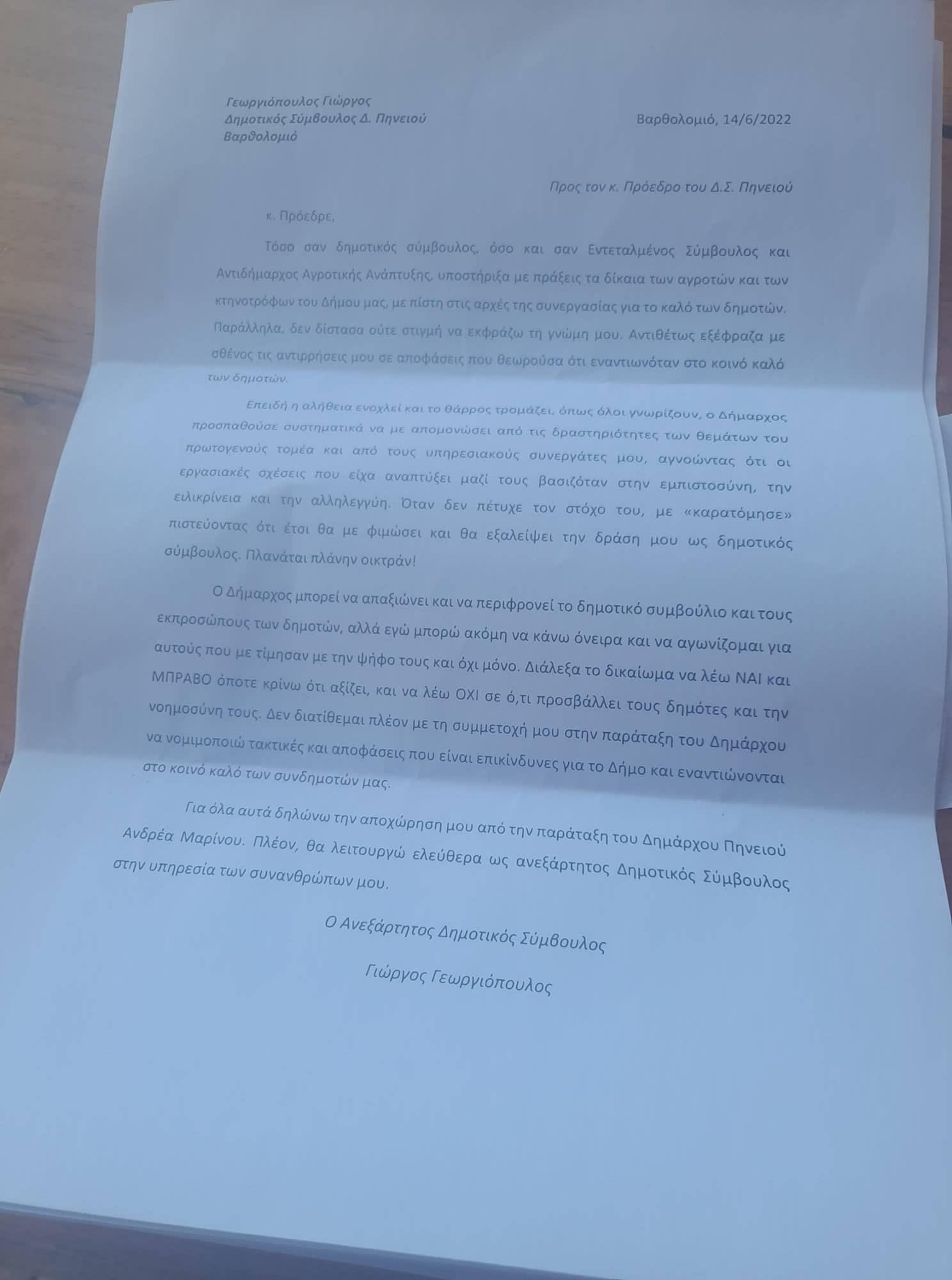 Για όλα αυτά δηλώνω την αποχώρηση μου από την παράταξη του Δημάρχου Πηνειού Ανδρέα Μαρίνου. Πλέον, θα λειτουργώ ελεύθερα ως ανεξάρτητος δημοτικός σύμβουλος στην υπηρεσία των συνανθρώπων μου.