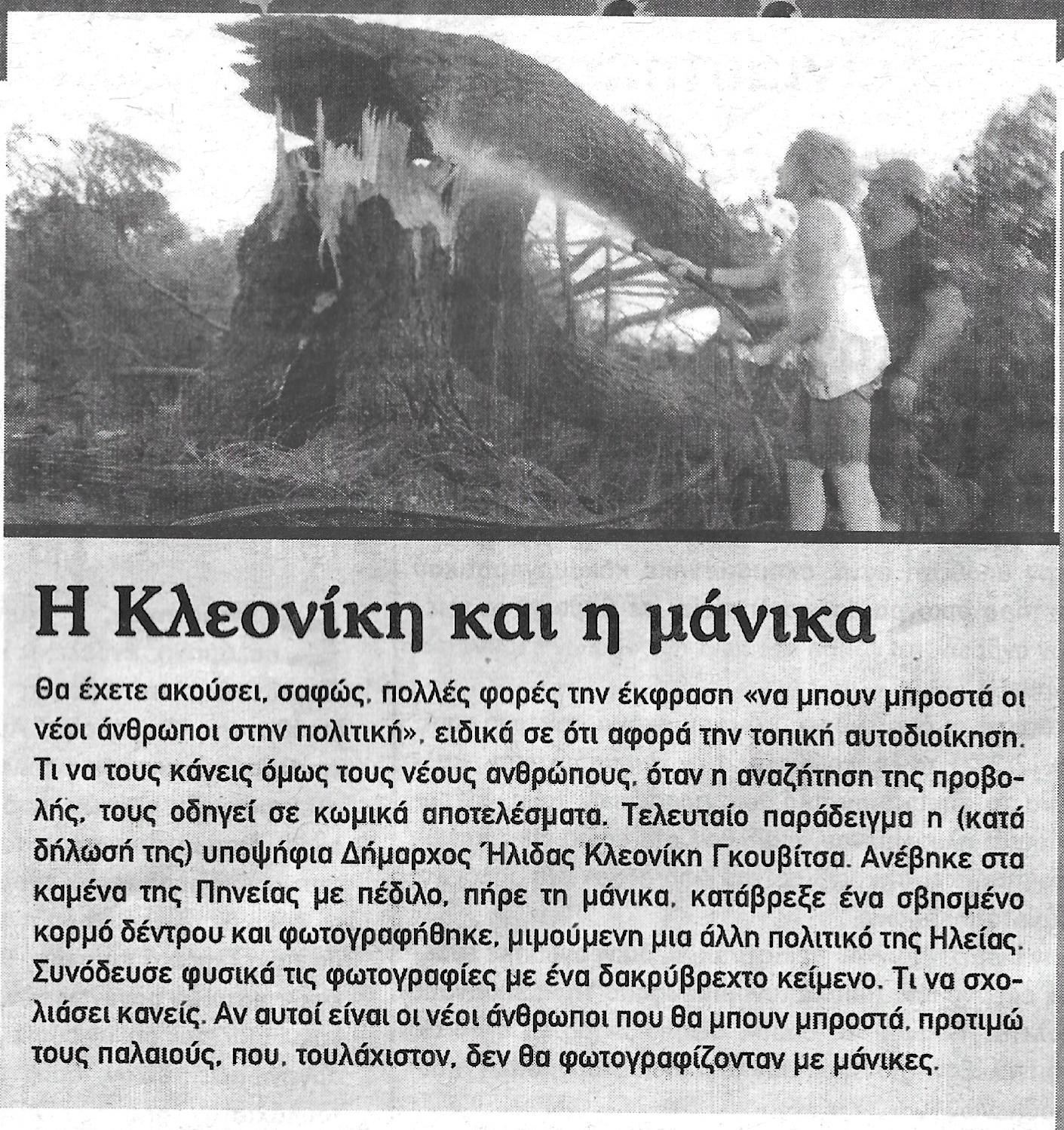 Προφανώς η κ. Κλεονίκη Γκουβίτσα ζήλεψε τη… ‘δόξα’ της Θεοδώρας Αυγερινοπούλου και του αντιπεριφερειάρχη Θεόδωρου Βασιλόπουλου που πέρισυ είχαν πάρει… μάνικες να σβήσουν φωτιές!!!! Με την διαφορά ότι οι δύο τελευταίοι τουλάχιστον έσβηναν πραγματικές φωτιές και δεν έριχναν νερό σε σβησμένο κούτσουρο!!!!!!