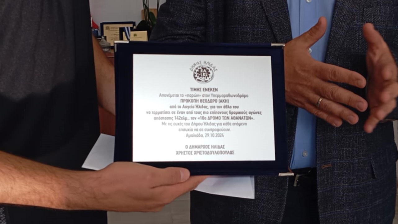 Τον υπερμαραθωνοδρόμο κ. Άκη Προκόπη από το Αύγειο Ήλιδας, για τον άθλο του να τρέξει τα 142 χιλιόμετρα του «10 ου Δρόμου των Αθανάτων» που ξεκίνησε από την Τρίπολη και μέσω της Σπάρτης και του Μυστρά κατέληξε στην κεντρική πλατεία της Καλαμάτας, τίμησε ο Δήμαρχος Ήλιδας κ. Χρήστος Χριστοδουλόπουλος.